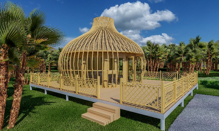 設計理念源于“鳥籠”結構整齊大氣的布局令人歸隱山林,敞開心扉,歸隱山林,具有開放式的玲瓏造型,賦予了它獨特的真實感和具有震撼力的形體,外觀即為建筑的結構,立面與結構達到了高度的統(tǒng)一。室內設有臥室和洗漱間,