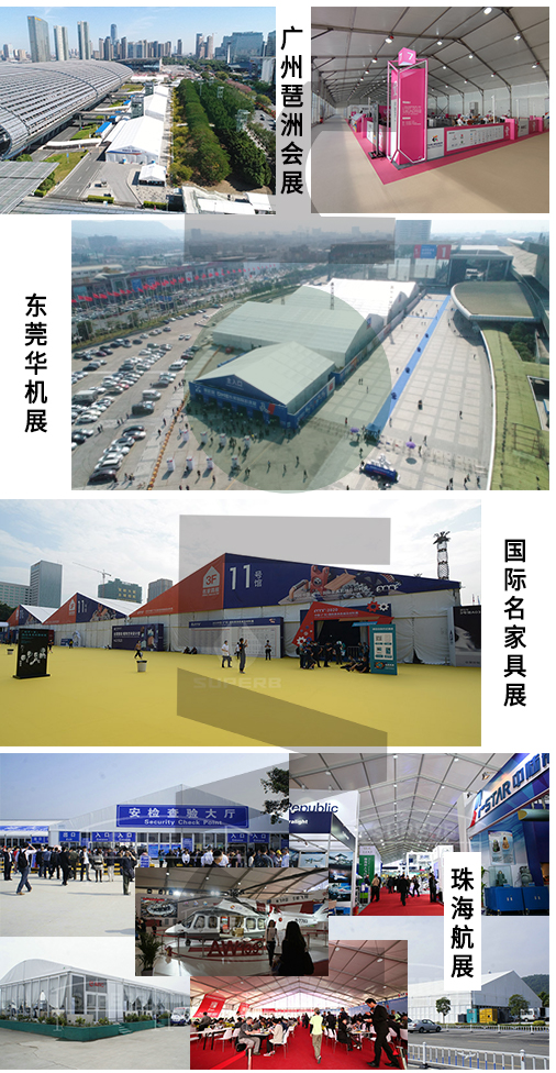 我司嚴(yán)格執(zhí)行ISO9001的質(zhì)量管理體系,確保不良產(chǎn)品的最小化及客戶滿意度的最大化。我們的的主要產(chǎn)品包括可移動(dòng)的模塊化鋁合金支架篷房,有不同風(fēng)格的篷房及裝飾可供選擇,篷房跨度從3米到60米。此外,還包括錐頂篷房和吊頂篷房,以及篷房配件,如照明燈具、地板、空調(diào)、桌椅及其它用于篷房內(nèi)部的家具。篷房可廣泛應(yīng)用于大小型活動(dòng)、婚慶、展會(huì)、體育、酒店、航空和工業(yè)等其它領(lǐng)域。篷房框架結(jié)構(gòu)為高強(qiáng)度鋁合金6061/T6型材,篷布為防水、阻燃的雙面PVC涂層聚酯纖維布,主體結(jié)構(gòu)風(fēng)載荷不少于100Km/h。